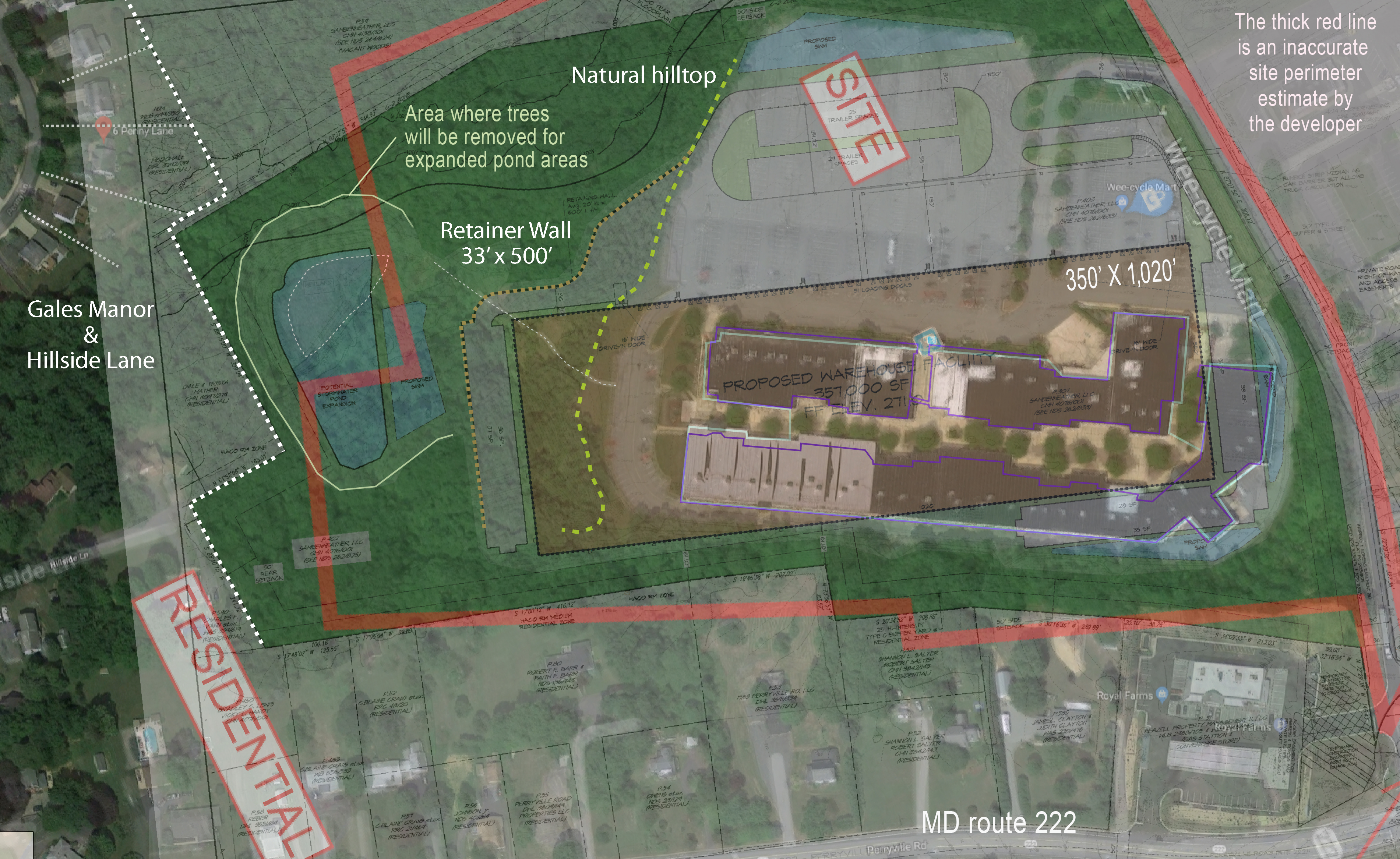 For scale, the END wall of the warehouse, at 350’ is longer than the length of a football field. It will face the homes on Penny Lane and Hillside Lane.